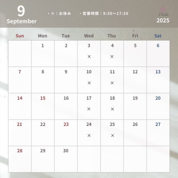 2025/09/02\ 9月の営業日のお知らせ🌿 / いつもL’avenirをご利用いただき、誠にありがとうございます🕊️ 暑さや紫外線でダメージを受けたお肌や、夏に溜まった疲れたお身体は、早め …