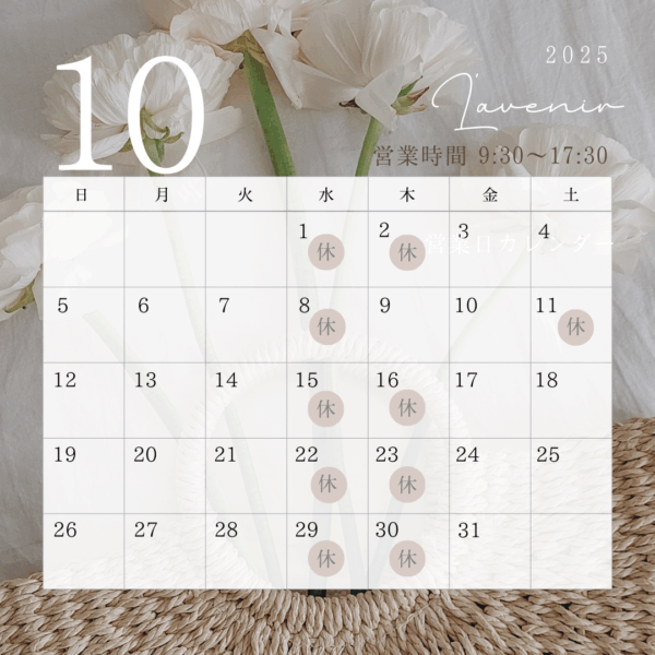 2025/09/30📅\10月の営業日カレンダー/ 秋の深まりとともに、お肌やお身体のケアがより大切な季節となりました🍁 ご予約はもちろん、お悩みのご相談も承っております。 なお、近日中にキャンペーン情報をL …