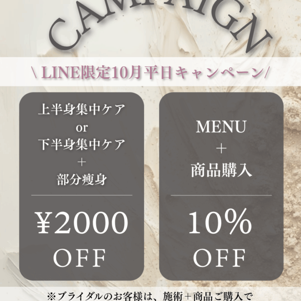 2025/10/0410月平日キャンペーンのご案内 日頃よりL’avenirをご愛顧いただき、誠にありがとうございます。 季節も秋に入り、日差しや気温の変化、夏の疲れなどによってお肌やお体に影響を感じやすい時期となりました 乾燥やくすみ、冷 …