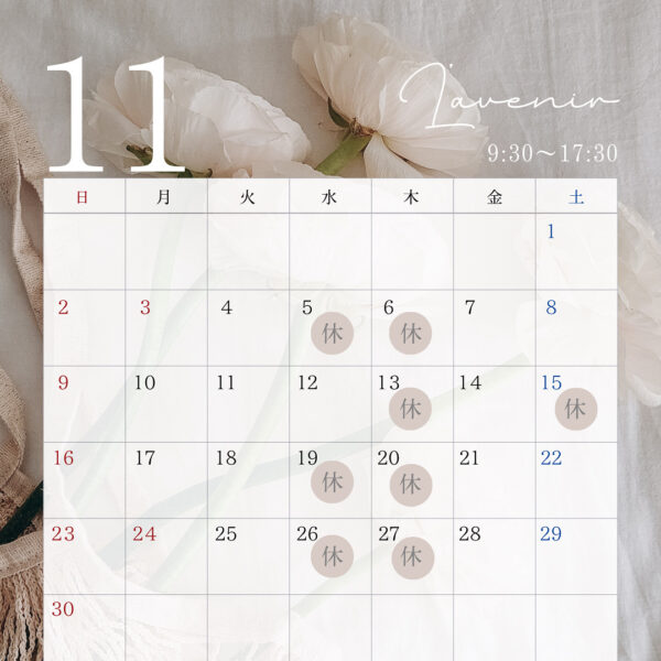 2025/10/24🍁 朝晩がぐっと冷え込むようになり、季節の変化を感じる頃ですね。 いつも当サロンをご利用いただき、誠にありがとうございます。 ✨ 11月の営業日について 通常、水曜・木曜は定休日ですが、 1 …